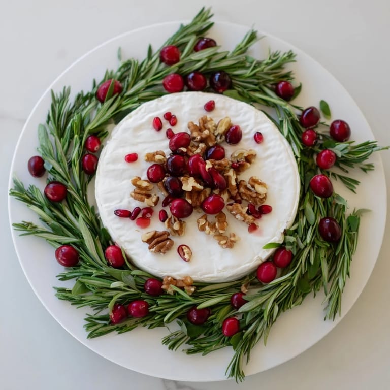 - Arrange the rosemary sprigs around the edge of the Brie to form a decorative wreath.