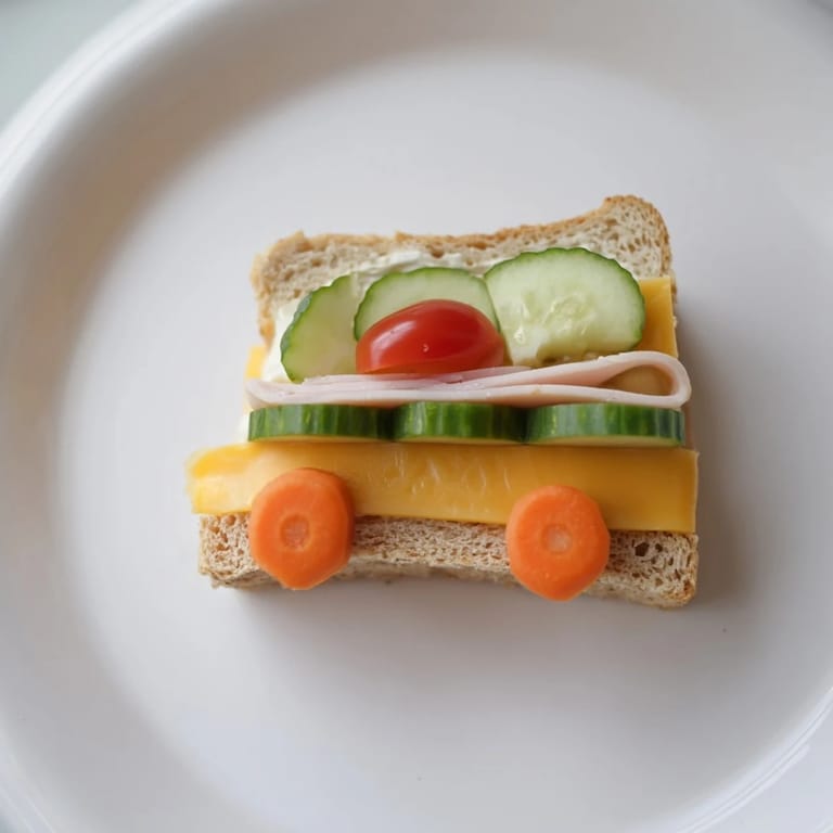 - Decoration & Wheels: 4 round cucumber slices, 4 grape tomatoes or black olives, 2 baby carrots, 1 sheet nori or spinach tortilla (for windshield/trim optional)