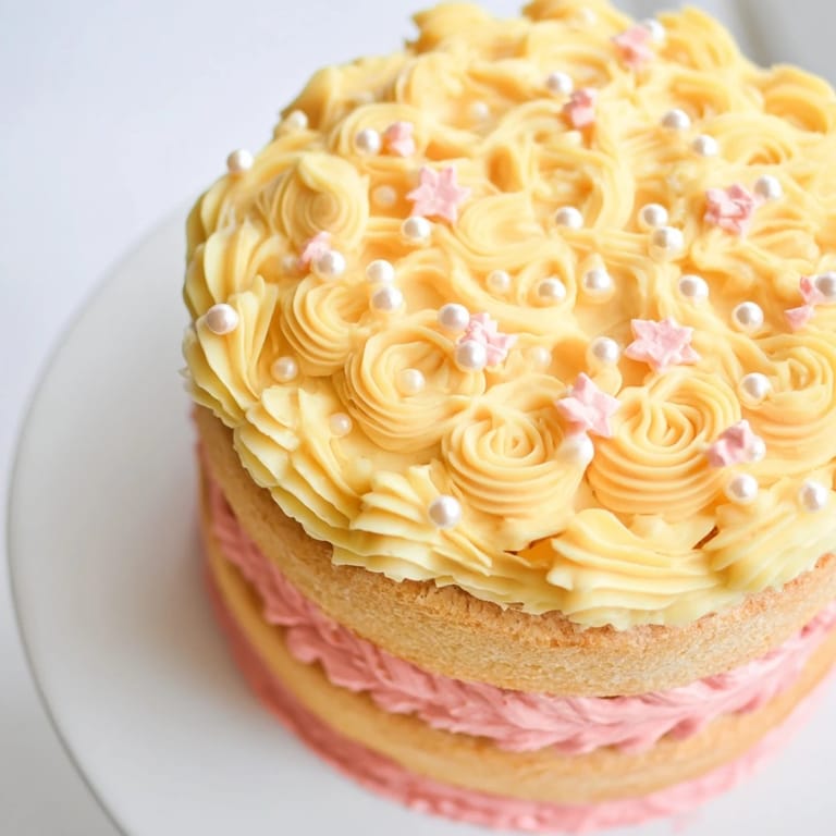 - Level cake layers if needed. Place one layer on a serving plate and spread with pink buttercream. Top with the second layer; frost the entire cake with yellow buttercream.