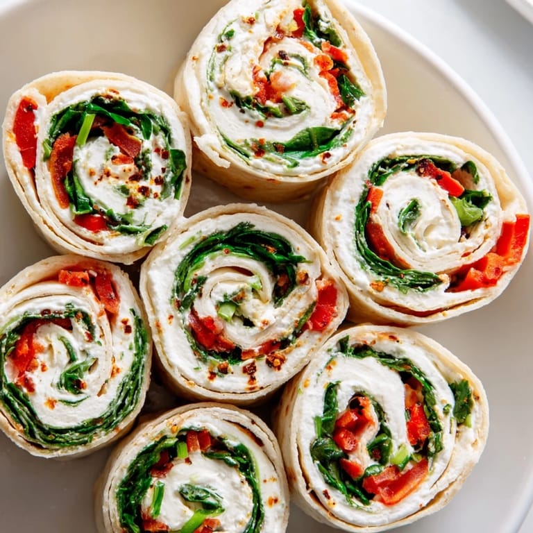 Save Festive and colorful tortilla roll-ups filled with cream cheese, roasted peppers, and spinach—perfect for holiday parties and gatherings.
