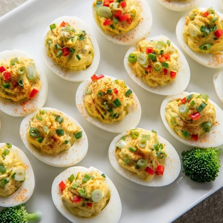 - Decorate the deviled eggs Sprinkle finely diced red and yellow bell pepper and green onion over the eggs as ornaments Place broccoli floret at the base for the tree trunk Garnish with dill sprigs to resemble pine branches if desired Add a few pomegranate seeds for extra festive color if using Lightly dust with extra smoked paprika for color.
