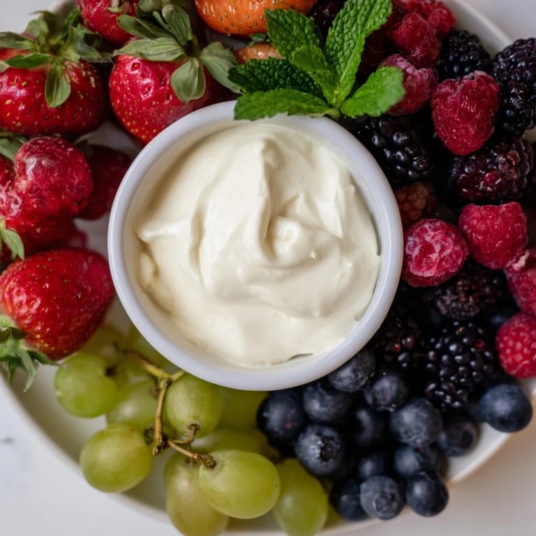 Save A festive and vibrant platter featuring fresh berries and a luscious, creamy dip โ perfect for holiday gatherings or a cheerful dessert.