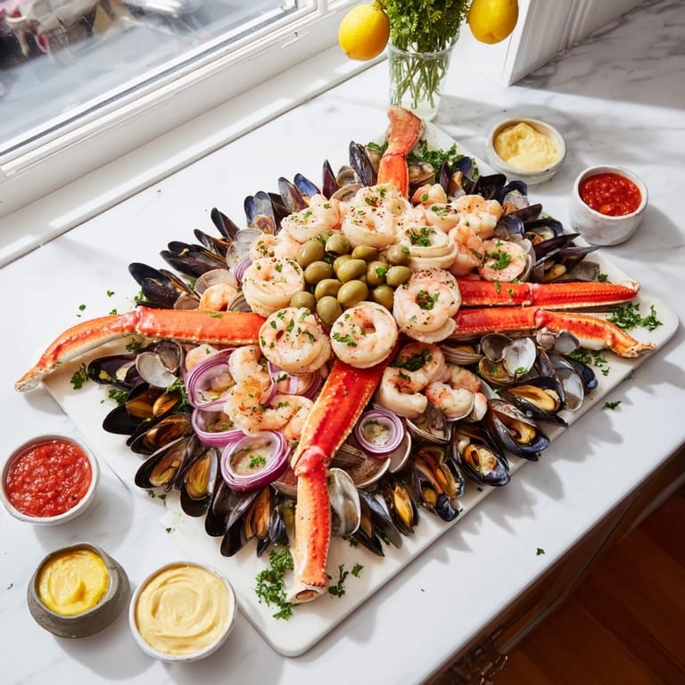 Chilled and fresh, every bite offers the briny essence of the sea, complemented by zesty sauces and savory garnishes. The mixture of textures—from tender scallops to crunchy crackers—makes each mouthful exciting. Whether set out as the star attraction or a sophisticated starter, this appetizer board delivers both beauty and deliciousness.